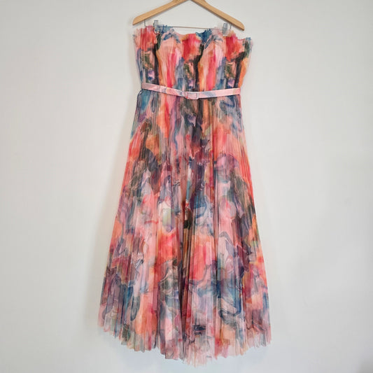 Hutch Coral Multi Swirl Strapless Pleated Fit Flare Belted Midi Dress Sz 14
