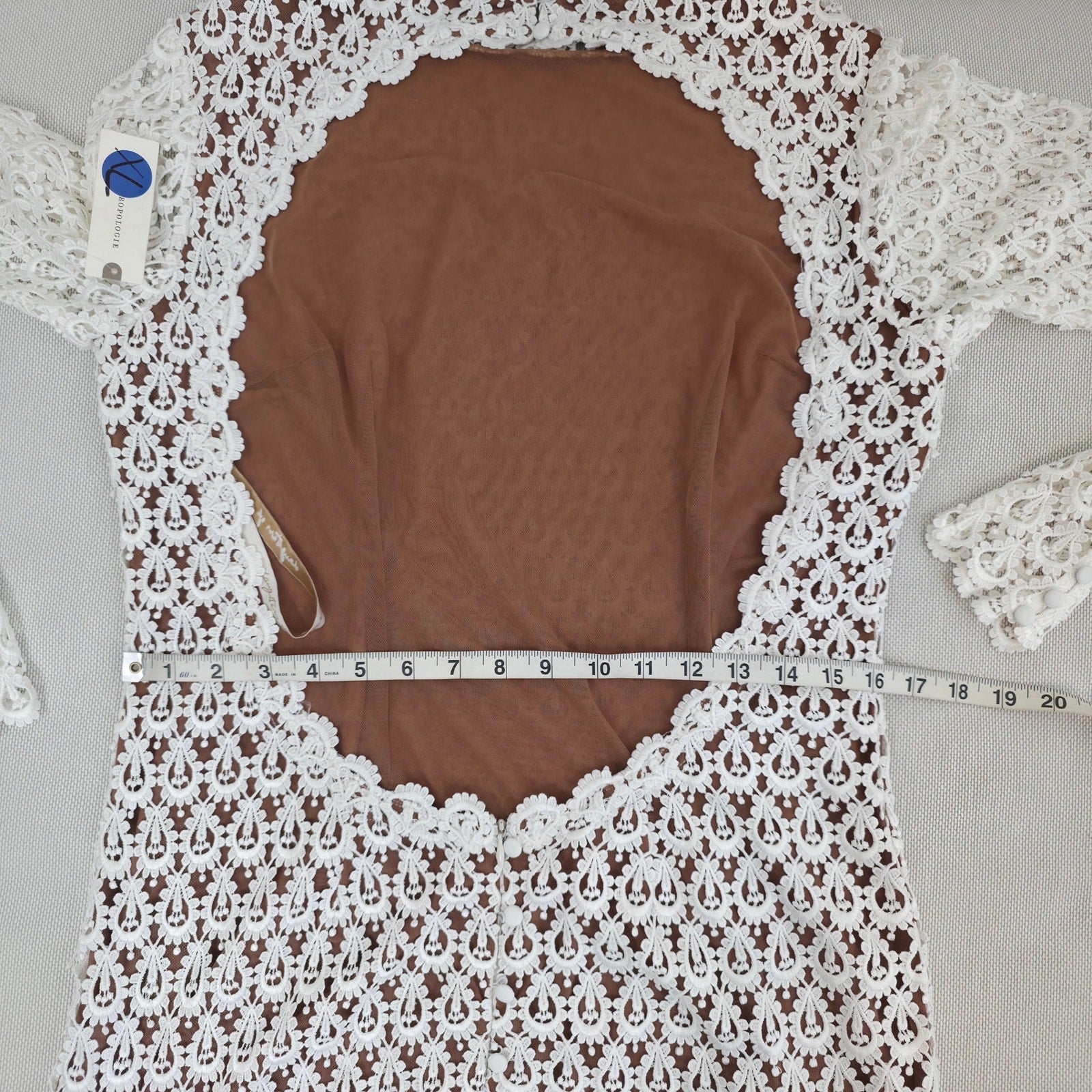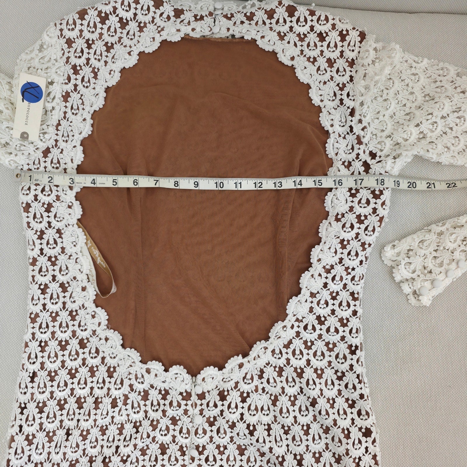 The open back is beautifully framed with delicate lace trim, while satin-covered buttons accent the back of the neck and wrists for a timeless, romantic finish.