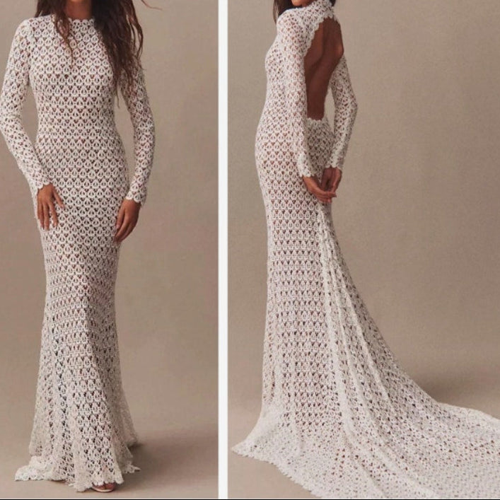 Elegant crochet lace bohemian wedding gown featuring a refined high neckline and unlined long sleeves. The fitted bodice flows into a flattering fit-and-flare silhouette, enhancing the natural shape before cascading into a full, sweeping train.