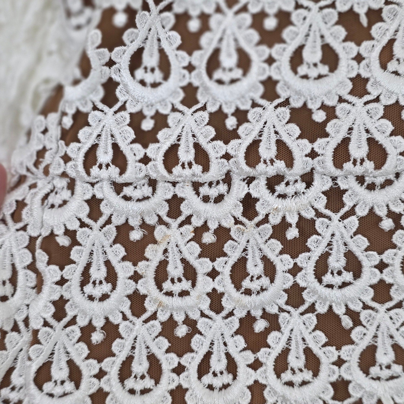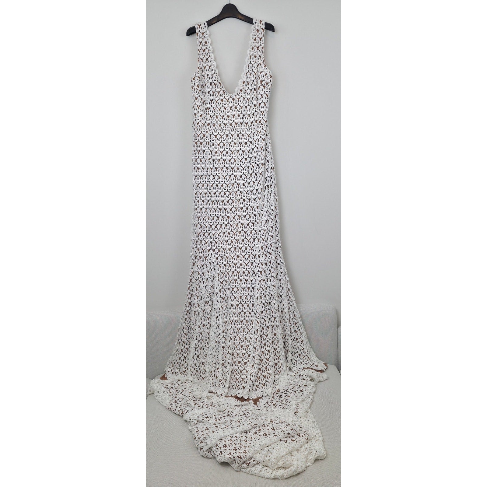 Scalloped crochet lace gown featuring a deep V-neckline and a defined waist seam that enhances the silhouette. The fitted design highlights your shape, while delicate eyelash trim frames the low open back for a soft, romantic finish.
