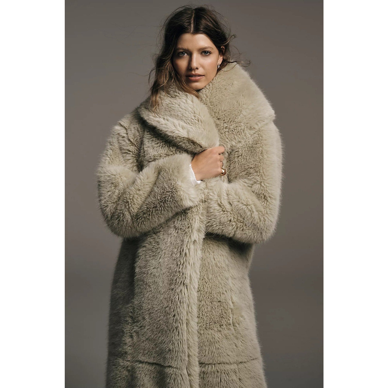Fabulous stand-out topcoat is featured in a staple longline silhouette with defined collar and cozy faux-fur fabrication for an added special finish.