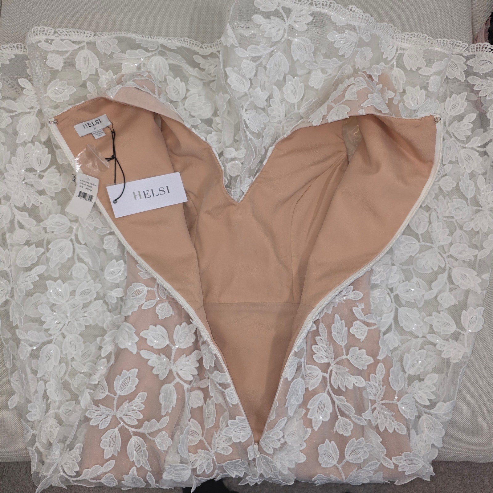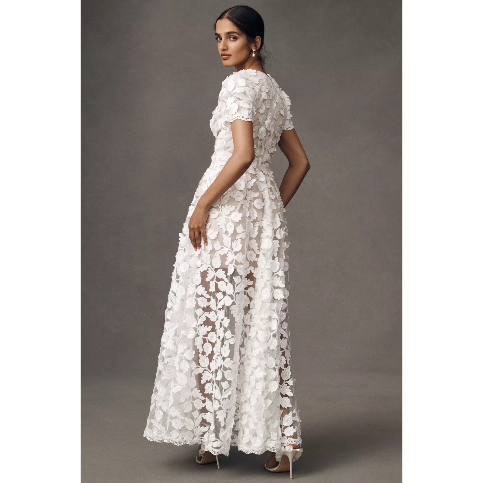 The Helsi Clara Maxi Dress is a romantic A-line silhouette with delicate puff sleeves, intricate floral appliqué detailing, and a full skirt that transitions to sheer for an ethereal finish.