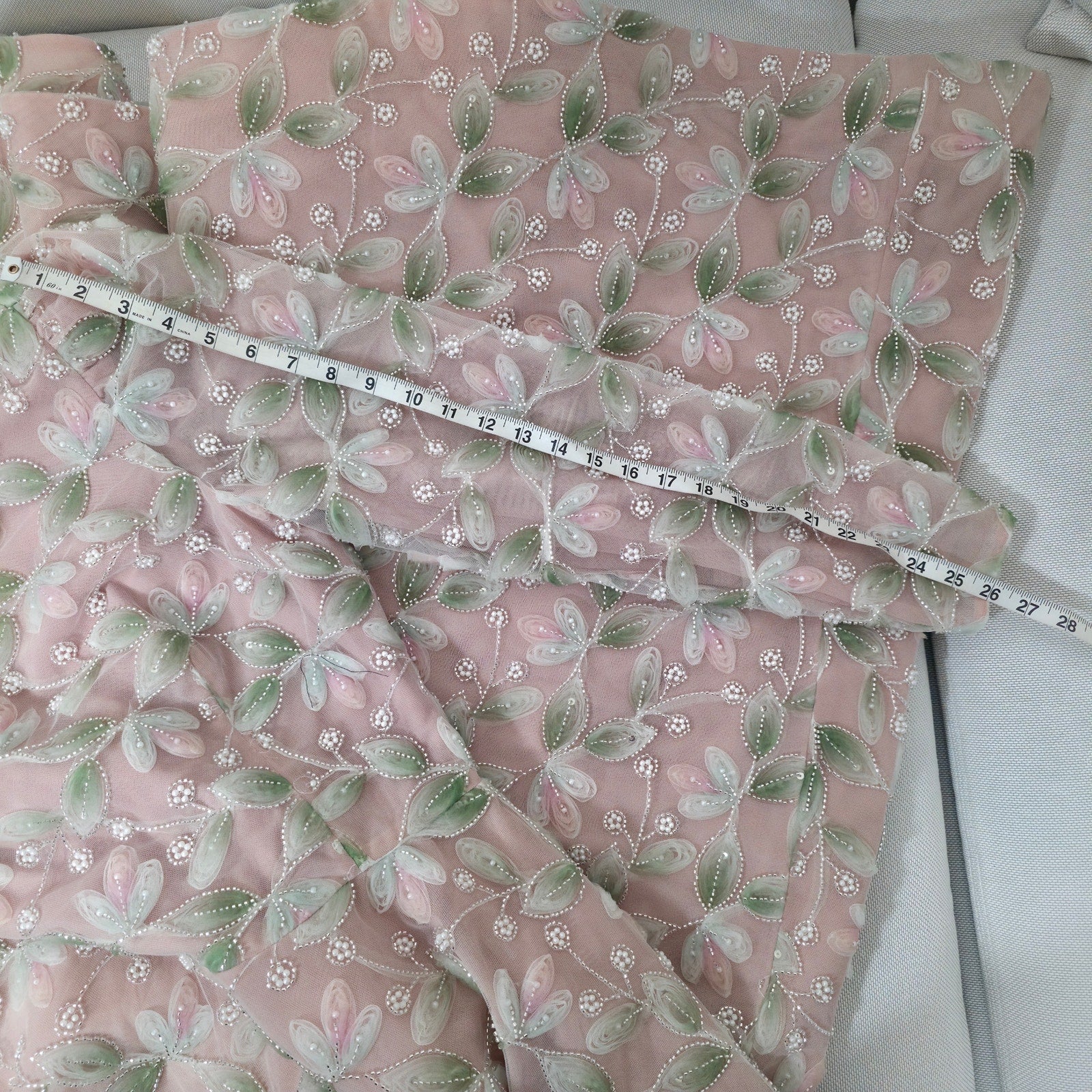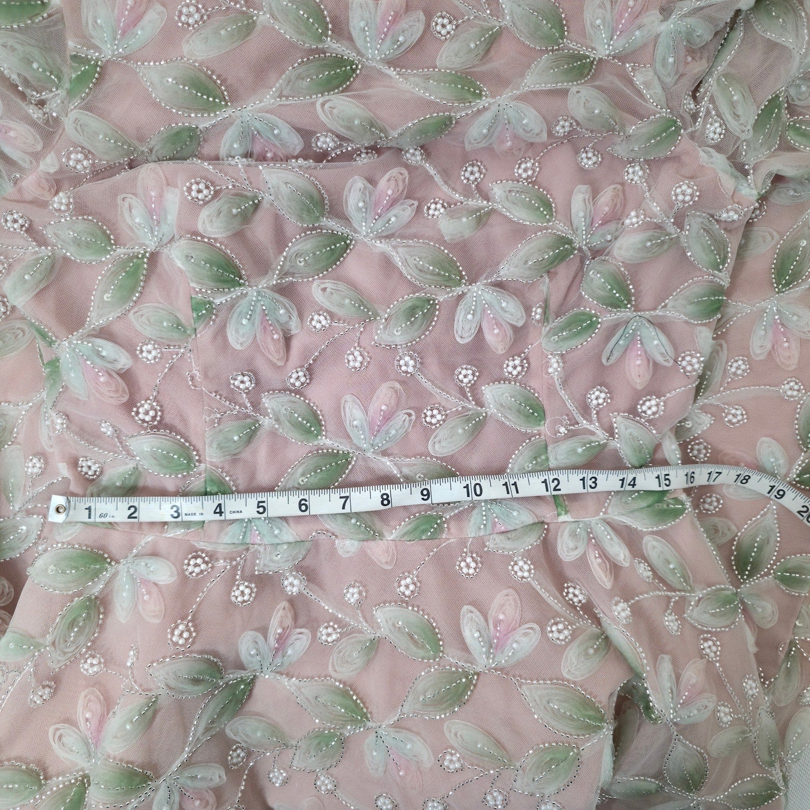 Mesh fabrication with allover appliqué detail and beaded embellishment