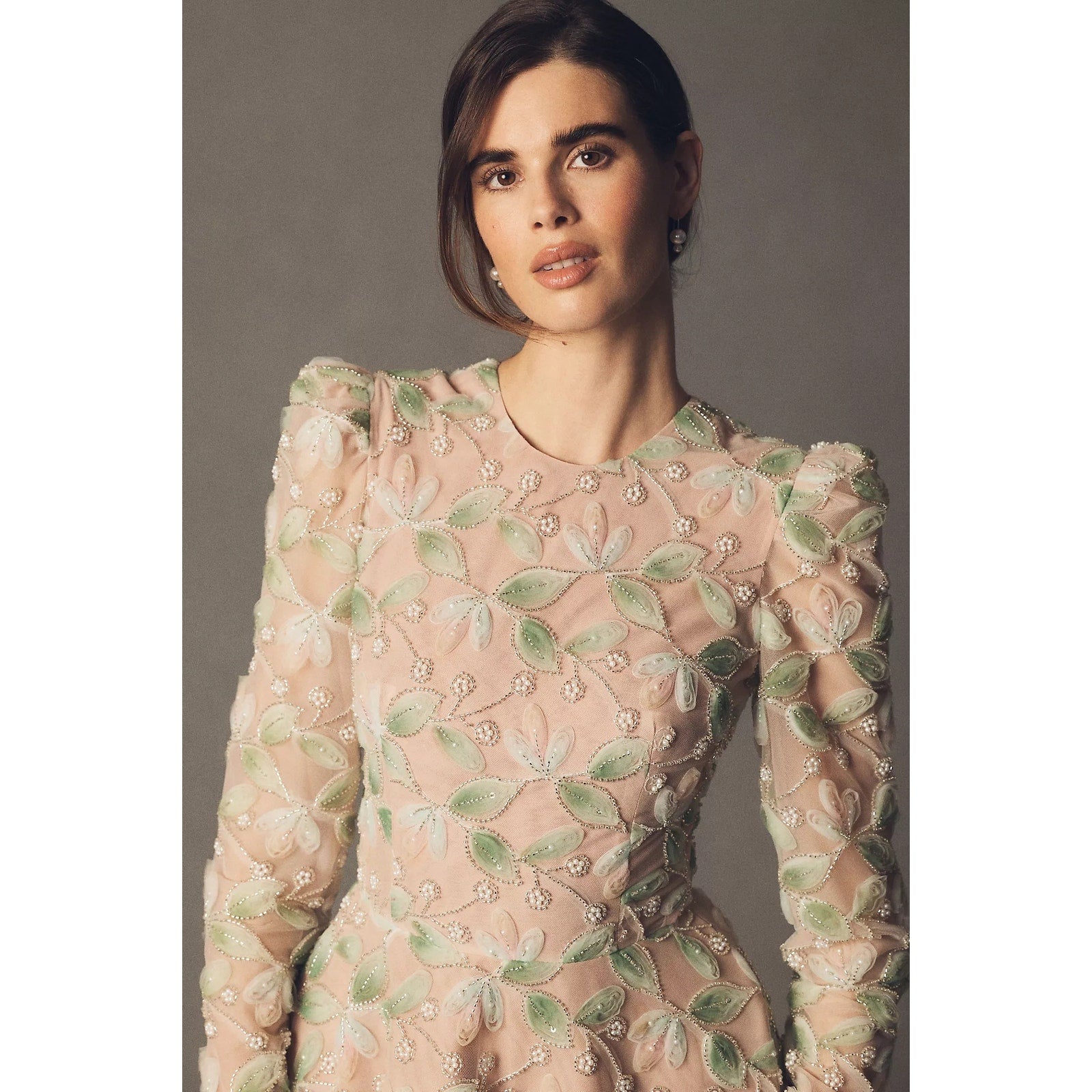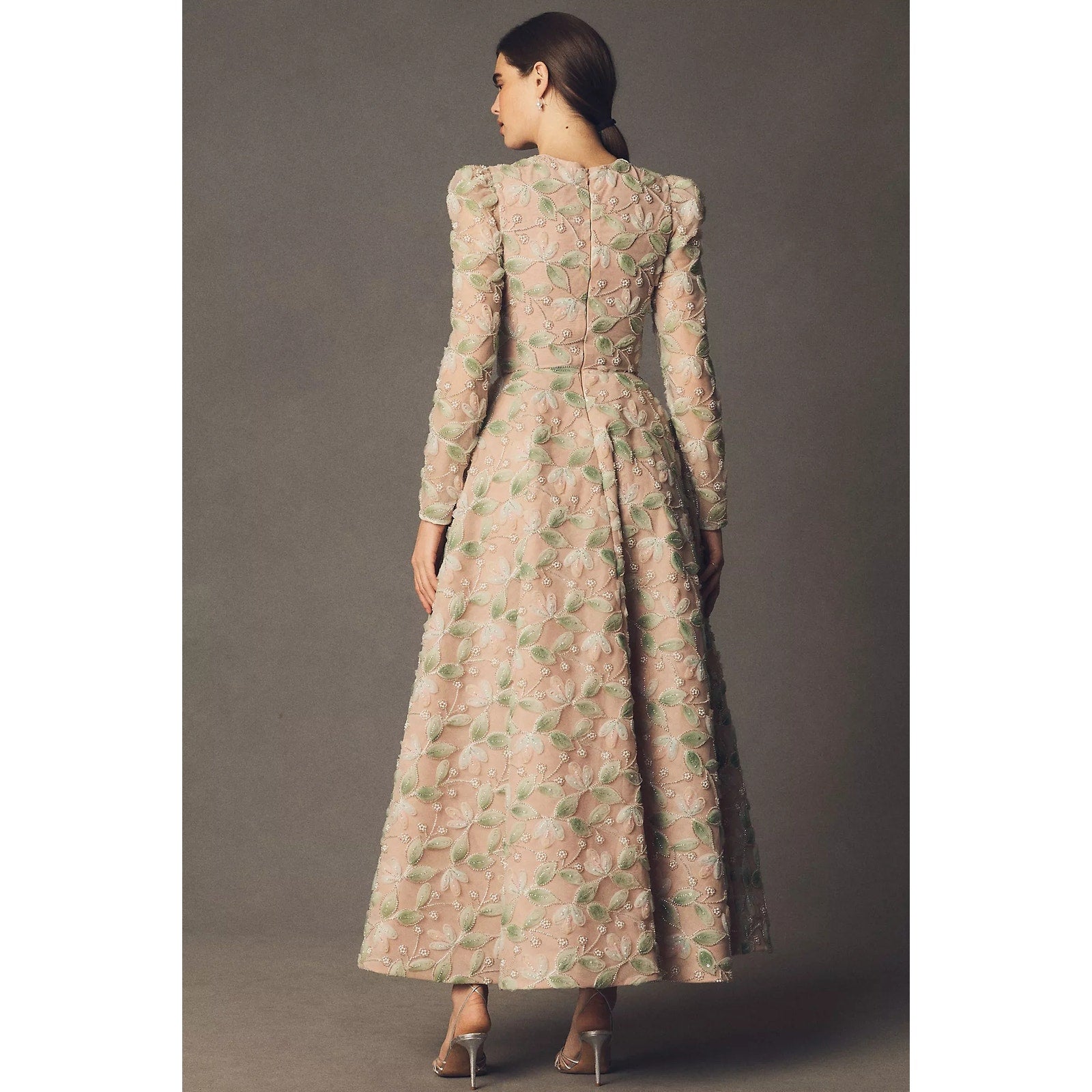 The Tessa Dress is an intricately embellished maxi featuring a timeless A-line silhouette, stunning appliqué and beaded detail, and puff sleeves. A full, structured skirt completes the look.